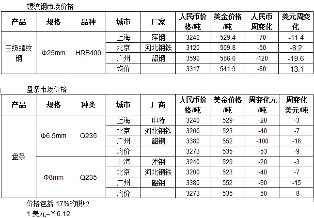 近期的周,全国的建材价格仍旧较弱,成交量未见起色。截至发稿,国内三级螺纹钢主要城市均价541.9美元/吨;Ф8mm高线均价535美元/吨。上海期货交易所螺纹钢期货1405合约2月17日收报3455元/吨($565),较上周涨6美元。(1$=¥6.12)