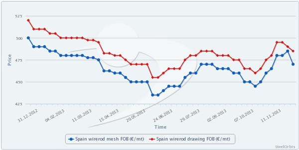 SteelOrbis全球钢铁网获悉,西班牙网用线材及拉丝材出口报价分别为470欧元/吨(644美元/吨)(FOB)和485欧元/吨(664美元/吨)(FOB),价格近两周来已下滑10欧元/吨(14美元/吨)。市场人士表示,部分网用线材出口订单报价为465欧元/吨(637美元/吨)(FOB),但市场需求疲软,且暂未有交易成交。