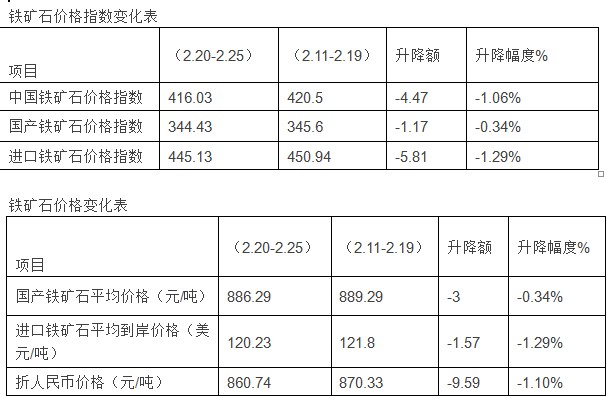 截止2014年2月25日,中国铁矿石价格指数为416.03点,环比下降4.47点,跌幅为1.06%。其中:国产铁矿石价格指数为344.43点,环比跌1.17;进口铁矿石价格指数为445.13点,环比跌5.81点,跌幅为1.29%。