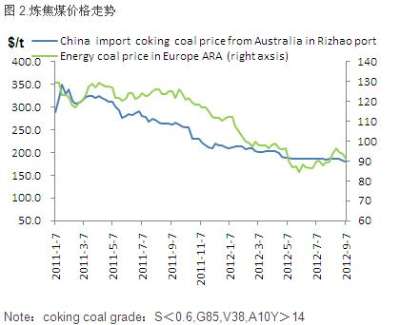 焦炭价格继续弱势运行,但是日照港进口焦煤价格依旧坚挺。澳大利亚炼焦煤(S<0.6,G85,V38,A10Y>14)到港价格(CFR)约为182美元/吨。本周国际动力煤价格小幅波动,欧洲ARA动力煤报92美元。原料市场陷入弱势震荡走势的概率加大。