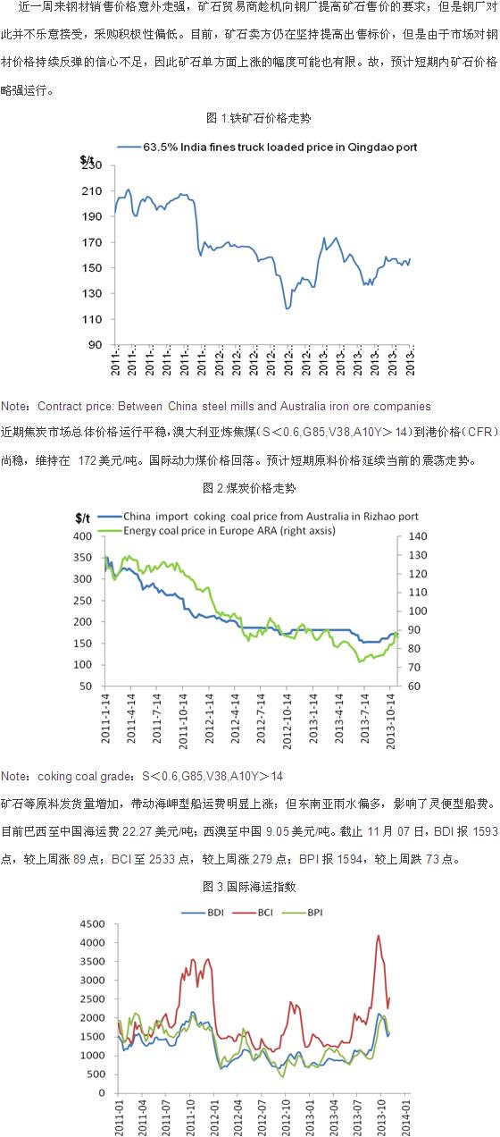 近期的一周来,国际原料价格略强,澳洲、巴西、印度铁矿石价反弹;进口煤焦价格和焦炭价格没有明显的波动;海运指数BDI、BPI和BCI总体走强。
