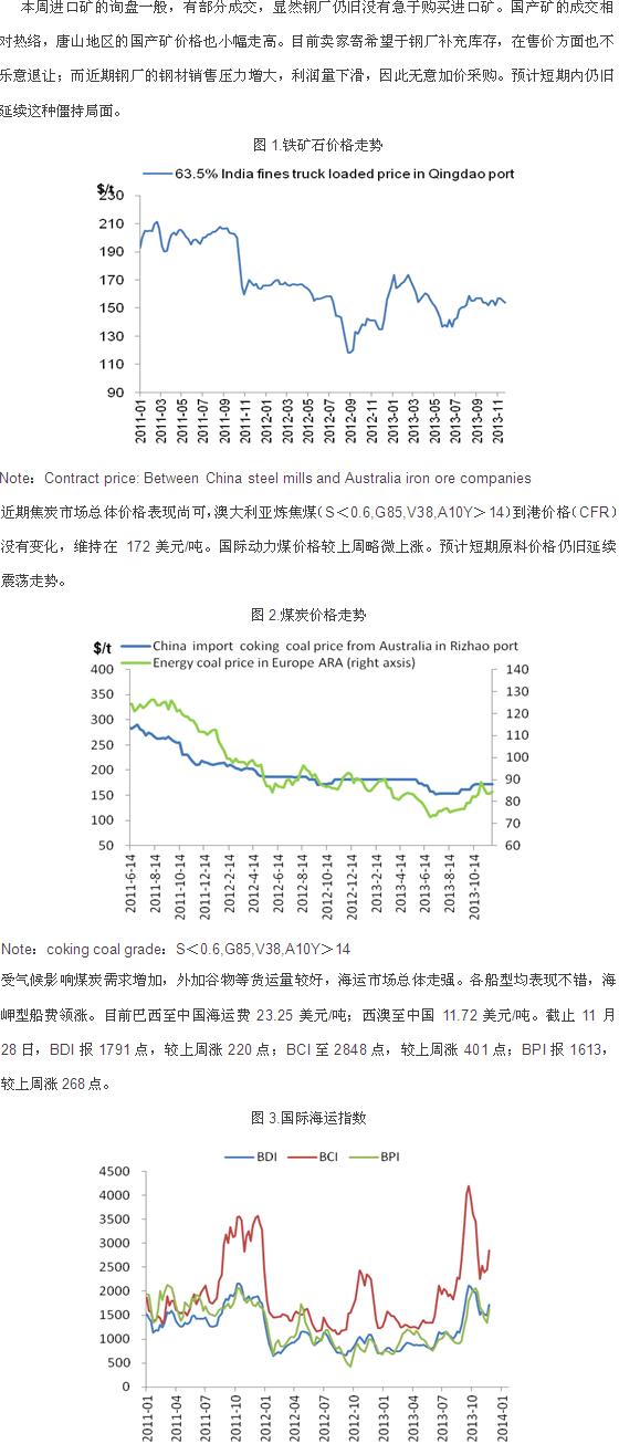 近期的一周来,国际原料价格呈震荡走势,澳洲、巴西、印度铁矿石价稳重略弱;进口煤焦价格和焦炭价格平稳;海运指数BDI、BPI和BCI总体走强。