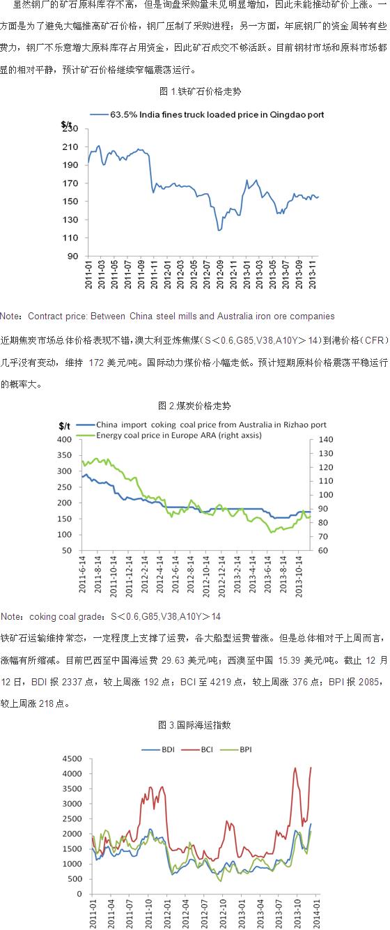 近期的一周来,国际原料价格呈窄幅震荡,矿石价格维持平稳;进口煤焦价格和焦炭价格略强;海运指数BDI、BPI和BCI创下三年新高。