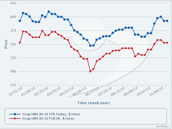 上周,土耳其钢厂忙于采购进口废钢,目前几乎已经完成12月的补仓活动。同时,市场上进口废钢1月的报价相比上月有所下调。近期,土耳其以371美元/吨(CFR)的价格成交了一批英国产HMS I/II 70:30废钢,以389美元/吨(CFR)的价格成交了一批美国产HMS I/II 80:20废钢。本周,土耳其市场进口废钢的采购活动减缓,而土耳其里拉兑美元的汇率下跌致使买家较为谨慎。尽管目前的库存水平几乎充足,但不可否认的是成材出口市场成交惨淡的状况也使得土耳其钢厂减缓了采购废钢的步伐,相应的进口废钢价格就有所下跌。