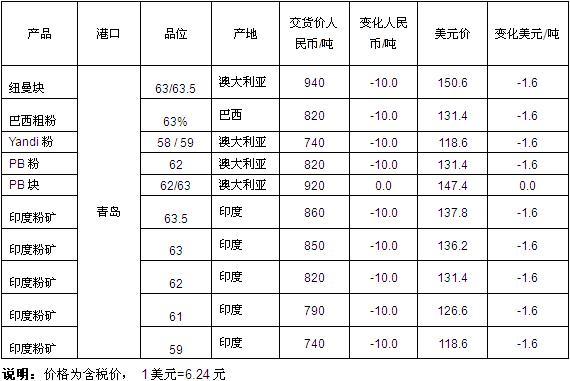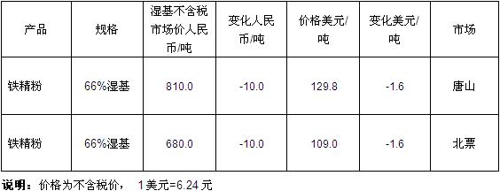 截止收稿前,青岛港63.5%印度粉矿137.8美元/吨;唐山地区66%铁精粉价格为129.8美元/吨(EX-VAT),北票地区66%铁精粉报价109美元/吨(EX-VAT)。