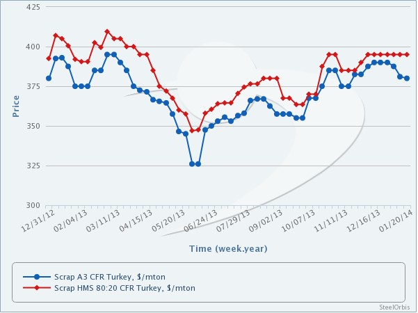 另一方面,随着黑海地区废钢价格的下调,俄罗斯A3废钢对土耳其的报价也下滑至380-385美元/吨(CFR);而罗马尼亚A3废钢对土耳其的报价也下滑至375-380美元/吨(CFR)。然而,土耳其生产商对近海废钢的还盘价为370-375美元/吨(CFR)。
