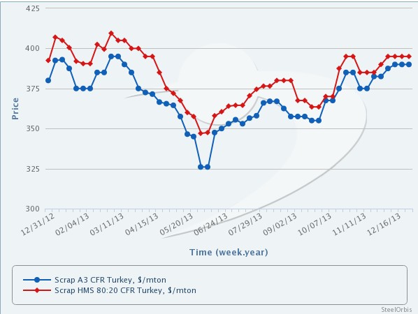随着新年的到来,土耳其废钢市场进口成交活动频繁,钢厂都在为1月备货。最新的进口HMS I/II 80:20废钢成交价为395-405美元/吨,CFR。由于原料成本上涨,多数土耳其钢铁生产商都被迫减产。同时,由于美国内销价坚挺,该国资源出口报价也随之上行。目前没有美国出口的HMS I/II 80:20废钢在土耳其成交。