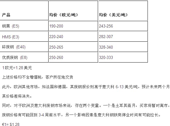 据悉,意大利废钢当地市场价格已基本跌至最低点,并且未来两个月,价格很难回升。此外,8月份成交量将更低。SteelOrbis全球钢铁网获悉,意大利废钢消费者协会称,7月份其废钢价格有可能进一步下滑,但幅度将有所减小。