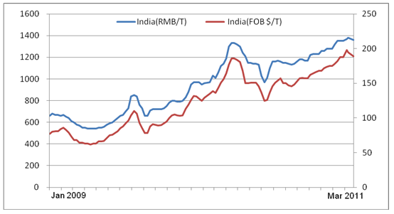 春节之后中国进口印度矿价格在连续冲高之后,逐渐开始回落。由于近期国内钢材市场持续疲软,铁矿石贸易商的信心也受到影响,进口矿价格也开始有所回落,在2月中下旬,印度粉矿(Fe 63.5%)到岸价格一度冲高到198美元/干吨,截至目前已经下跌至下跌至了188美元/干吨,目前钢厂采购相对清淡,现货成交较少。