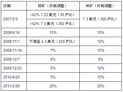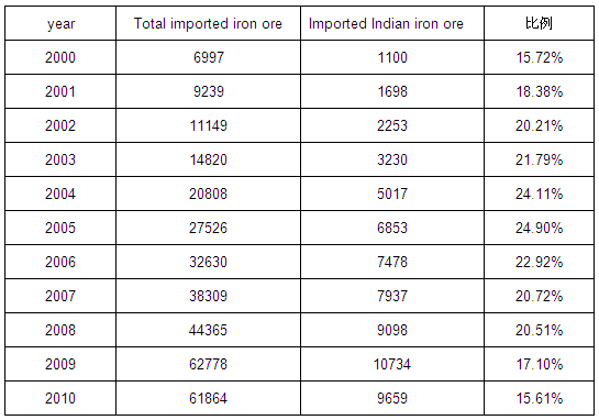 本次调整幅度最大的是对于粉矿的调整,如果按照目前的印度矿(Fe 63.5%)离岸价170美元/吨(FOB)计算,粉矿出口税上升到20%,出口成本增加22-25美元/吨,如果按照目前市场来看,印度铁矿石贸易商利润将被大幅压缩,甚至亏损。按照以前印度调整关税的经验来看,印度矿山、贸易商将把出口成本转嫁给中国采购商,这无疑将会对目前疲软的铁矿石市场产生一定的支撑作用。在2007年印度开始限制铁矿石出口之后,铁矿石关税也不断调整,中国进口印度矿的比例也持续下降。