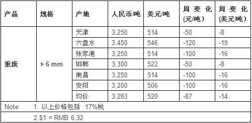 截止收稿,本周我国主要废钢交易市场的重废均价为3283元/吨(520$/t),较上周下跌达14美元。
