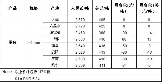 本周,我国废钢市场报价有所异动,涨跌方向出现分歧。华北地区的部分市场废钢价格拉涨,而其他地区仍以弱势为主。截止收稿,我国主要废钢交易市场的重废均价为2609元/吨(411$/t),较上周走低5美元。($1 = RMB 6.34)