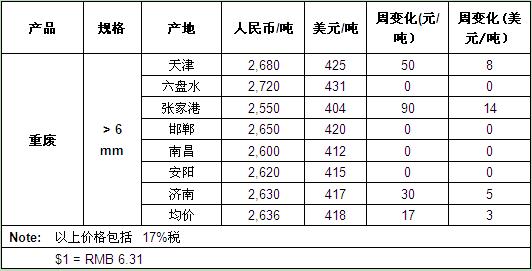 本周,我国废钢市场部分地区的报价小幅上扬,天津废钢交易市场走高8美元;沙钢集团的废钢收购价格上涨14美元,而其他地区仍以平稳为主。截止收稿,我国主要废钢交易市场的重废均价为2636元/吨(418$/t),较上周走高3美元。($1 = RMB 6.31)