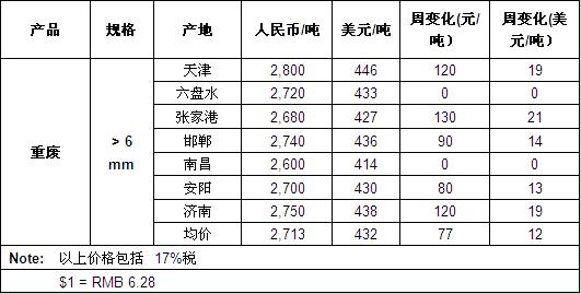 本周,我国废钢市场主要交易区的报价明年上涨;华东和华北地区废钢收购价格涨幅超过15美元。截止收稿,我国主要废钢交易市场的重废均价为2713元/吨(432$/t),较上周走高12美元。($1 = RMB 6.28)