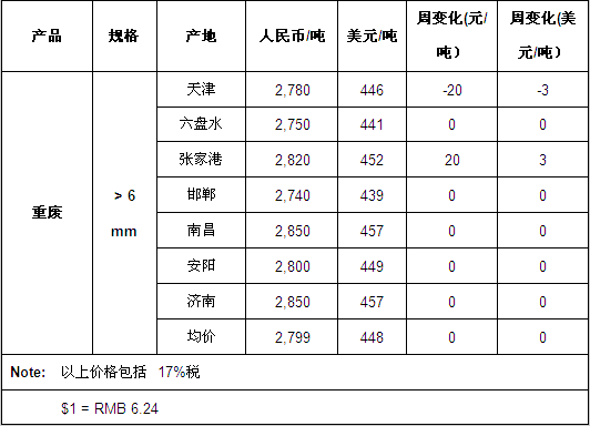 近一周来,废钢交易市场价格总体呈震荡运行态势,华东地区的废钢价格略强。截止收稿,我国主要废钢交易市场的重废均价为2799元/吨(448$/t),较上周持平。($1 = RMB 6.24)
