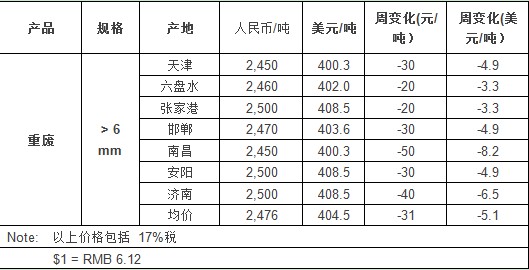 这一周来,全国各地区的废钢交易价继续下滑,成交较差。我国主要废钢交易市场的重废均价为2476元/吨(404.5$/t),较上周下滑5.1美元。($1 = RMB 6.12)