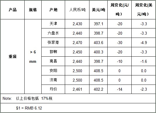 这一周来,全国主要废钢交易市场交易价延续弱势,成交停滞。我国主要废钢交易市场的重废均价为2461元/吨(402.2$/t),较上周下滑2.3美元。($1 = RMB 6.12)