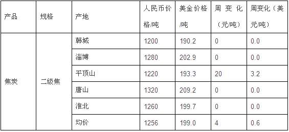 本周焦炭成交价走稳,并且部分地区尝试着提高焦炭售价。截止发稿,全国二级焦炭均价为199美元,较上周略涨0.6美元。大连期货交易所焦炭期货1301合约收盘1433元/吨(227USD/t),较上周小幅下滑。(1$=6.31RMB)