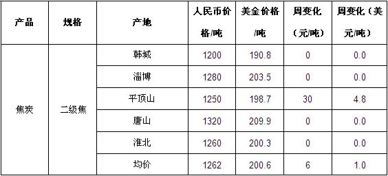 本周焦炭成交价呈震荡偏强走势,并且河南平顶山地区品质较好的焦炭价格继续调高价格。截止发稿,全国二级焦炭均价为200.6美元,较上周略涨1美元。大连期货交易所焦炭期货1301合约收盘1465元/吨(233USD/t),较上周小幅上涨。(1$=6.29RMB)