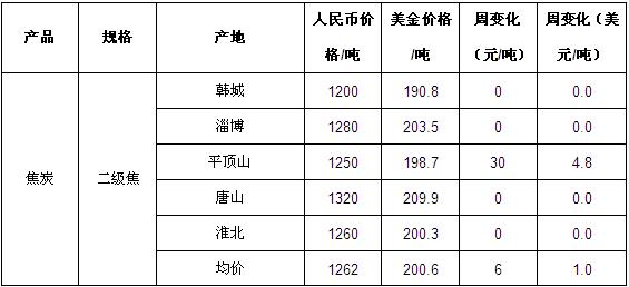 本周焦炭成交价延续平稳略强走势,除了河北地区焦炭现货交易价格略走高之后,其它地方的焦炭价格维持稳定。截止发稿,全国二级焦炭均价为201.6美元,较上周略涨1美元。大连期货交易所焦炭期货1301合约收盘1555元/吨(248USD/t),较上周明显走高。(1$=6.28RMB)