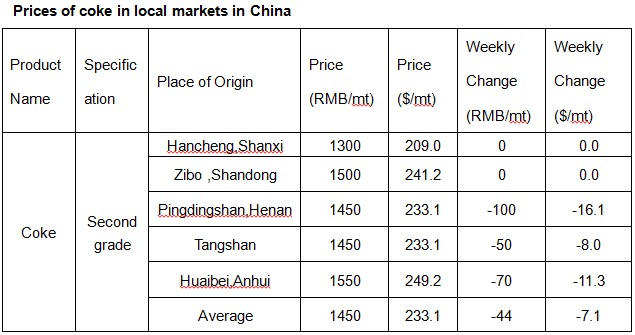截止今日这一周来,全国交易市场的焦炭成交价格继续走低,华中地区焦炭价格补跌。截止发稿,全国二级焦炭均价为233.1美元,较上周下跌7.1美元。大连期货交易所焦炭期货1309合约收盘1581元/吨(254美元/吨),较上周下跌98元/吨(16美元/吨)