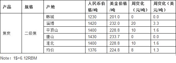 这一周来,本周焦炭市场成交维持正常水平,部分地区价格略有走强。截止发稿,全国二级焦炭均价为224.8美元,较上周涨1.3美元。大连期货交易所焦炭期货1405合约12月27日收盘1510元/吨(247USD/t),较上周回落4美元。(1$=6.12RMB)