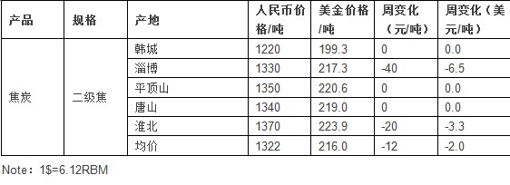 今天是节后商家第一次报价,大部分贸易商焦炭报价平稳,部分地区焦炭报价降低。截止发稿,全国二级焦炭均价为216美元,较节前跌2美元。大连期货交易所焦炭期货1405合约2月7日收盘1327元/吨(217USD/t),较节前回落7美元。(1$=6.12RMB)