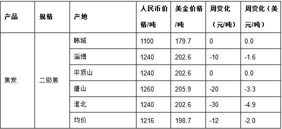 一周来,焦炭市场整体仍旧不强, 部分地区价格继续下跌,但整体上看跌幅明显缩小。截止发稿,全国二级焦炭均价为198.7美元,较上周跌2美元。大连期货交易所焦炭期货1405合约2月28日收盘1282元/吨(209USD/t),较上周跌9美元。(1$=6.12RMB)