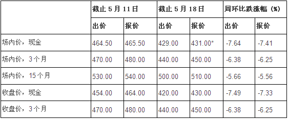 截止上周末(5月18日),伦敦金属交易所(LME)方坯市场连续6周下行,合约贸易价格波动如下图显示: