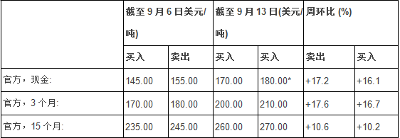以下为截至上周(9月13日)伦敦金属交易所方坯成交的价格走势: *官方现付卖出价货报价是指在LME2个交易日内付现。 截至9月13日的方坯库存量为34,645吨,与9月6日的36,275吨相比有所下降。