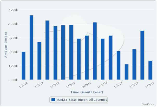 根据土耳其统计局公布的数据,今年5月份,土耳其废钢进口额大幅下滑28.7%,废钢进口量为130万吨,较2012年5月降低31.6%。
