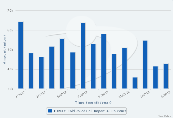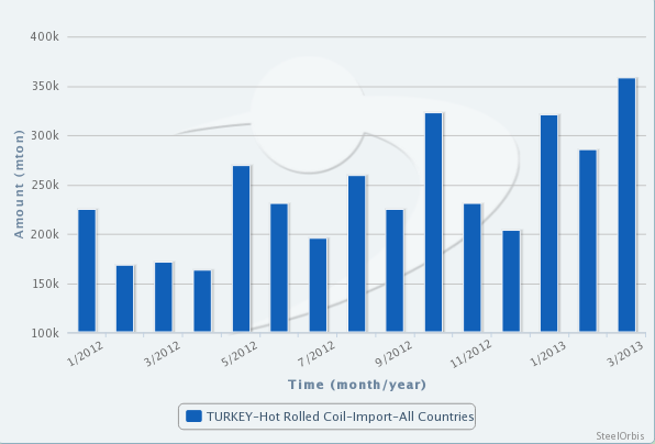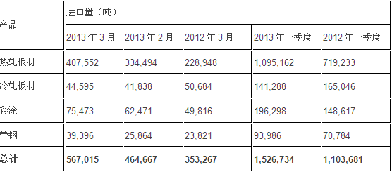 根据土耳其统计局公布的数据,今年3月,土耳其扁平材(包括热轧、冷轧、彩涂和窄带钢)进口量为567,015吨,环比增长22%,同比增60.5%;进口总值达3.78亿美元,环比增加22.8%,同比增加41.9%。