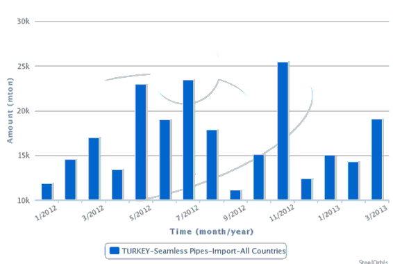 土耳其国家统计局发布的数据显示,2013年一季度,土耳其无缝管进口为48,109吨,同比增长11.3%,环比下降下降9.1%。2012年后三季度,土耳其无缝管进口量都超过50,000吨。3月份,土耳其无缝管进口为19,028吨,同比增长12.2%,环比增长33.45%。