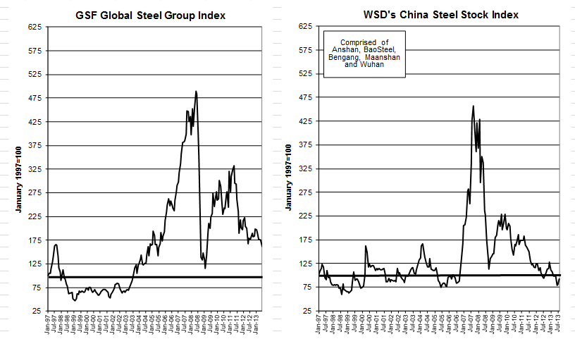 全球钢铁金融(GSF)全球钢铁股票指数自2011年中以来一直处于跌势,自最高峰的293下滑至目前的178,跌幅高达39%。同期,标普500指数从168升至208,增幅为23%。事实上,所有与钢铁相关的行业都表现不佳,包括远东、巴西、欧洲、俄罗斯、日本(最近有所恢复)和美国的钢铁公司: